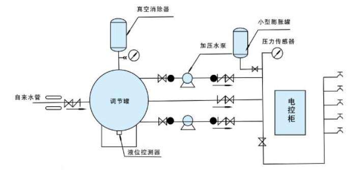 整套設(shè)備由穩(wěn)流罐、真空抑制器、變頻調(diào)速水泵機(jī)組、壓力傳感器、變頻控制柜、倒流防止器(可選)、消毒裝置(可選)、小流量保壓罐(可選)等組成。從市政管網(wǎng)引來的進(jìn)水管直接連接到穩(wěn)流罐的進(jìn)水口,穩(wěn)流罐的出水口通過消毒裝置后連接到加壓泵組的進(jìn)水管,加壓機(jī)組的出水管與用戶用水管連接,直接向用戶管網(wǎng)供水。