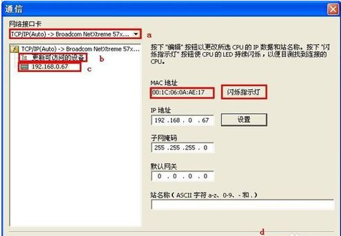 然后,進(jìn)行如下操作:a.單擊 “網(wǎng)絡(luò)接口卡” 下拉列表選擇編程設(shè)備的 “網(wǎng)絡(luò)接口卡”。 b. 雙擊 “更新可用設(shè)備” 來刷新網(wǎng)絡(luò)中存在的 CPU ; c. 在設(shè)備列表中跟據(jù) CPU 的 IP 地址選擇已連接的 CPU。 d. 選擇需要進(jìn)行下載的 CPU 的 IP 地址之后,單擊 “OK” 按鈕,建立連接。(同時(shí)只能選擇一個(gè) CPU 與Micro/WIN SMART 進(jìn)行通信)注意:如果網(wǎng)絡(luò)中存在不只一臺(tái)設(shè)備,用戶可以在 “通信” 對(duì)話框中左側(cè)的設(shè)備列表中選中某臺(tái)設(shè)備然后點(diǎn)擊 “Flash Lights” 按鈕輪流點(diǎn)亮 CPU 本體上的 RUN ,STOP 和 ERROR 燈來辨識(shí)該 CPU。 也可以通過 “MAC地址” 來確定網(wǎng)絡(luò)中的 CPU, MAC 地址在 CPU 本體上 “LINK” 指示燈的上方。
